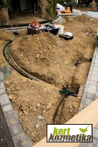 Miután elkészültek a burkolatok és az ágyásszegélyek, nekiláttunk a 6 zónás Hunter automata öntözőrendszer kivitelezésének. Ebből 4 zóna összesen 40 szórófejjel a gyepfelületeket öntözi, 1 zóna csepegtető rendszerrel a növényágyásokat látja el, egy további zóna pedig a dézsás növények öntözését teszi kényelmesebbé.
