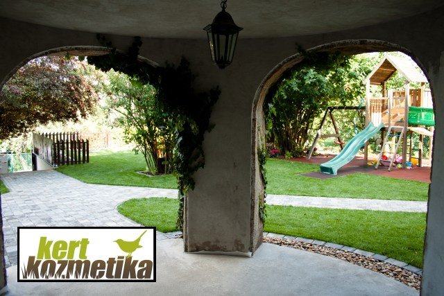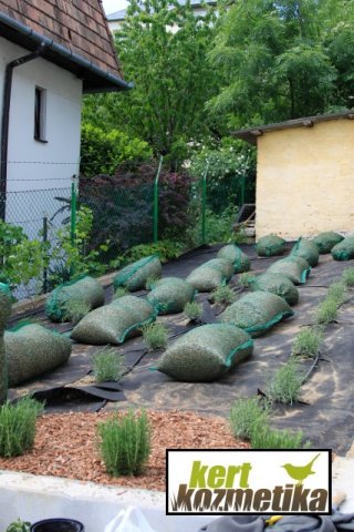 A füves terület szintkülönbségeinek feltöltéséhez és talajjavításhoz összesen 32 m³ termőföldet terítettünk szét. A kert egyik részén 150 m²-en vakondháló + gyepszőnyeg készült, a másik területen 120 m²-en fűmagos füvesítést alkalmaztunk.
