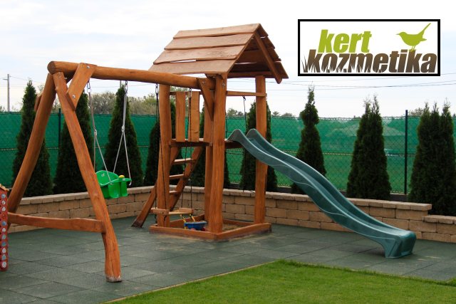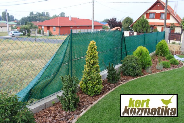 A fű megerősödése után még visszatértünk néhány kisebb, de fontos részletre: egy díszkutat építettünk be, a kerítésre szélfogó (árnyékoló) hálót rögzítettünk, valamint az utcára egy kiemelt növényágyást készítettünk. Végezetül befejeztük a kb. 35 m2-es játszótér zöld gumilapokból álló burkolását.