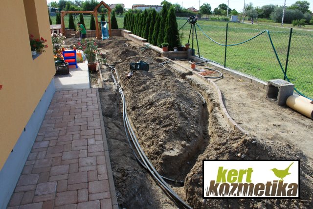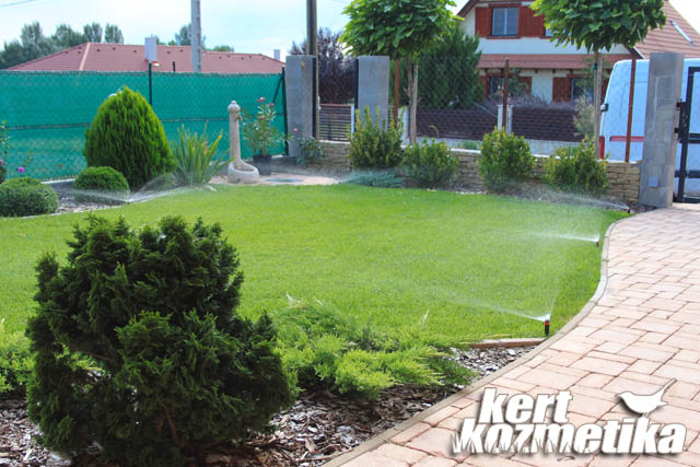 A kertben nem sokkal korábban egy bővizű fúrt kút készült, amelyhez csőszivattyút és nyomáskapcsolót kellett beépítenünk. A szivattyú beüzemelése után a 6 zónás Hunter automata öntözőrendszer kiépítésével folytattuk a kert megépítését. Öt zóna összesen 42 db szórófejjel öntözi a füves felületeket precízen, fejtől-fejig.