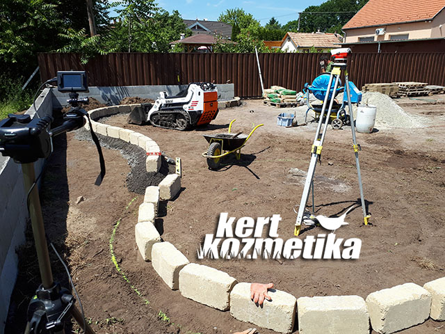 A kivitelezést hátulról a kert eleje felé haladva végeztük, hogy az anyagok lerakodása a munkaterülethez minél közelebb történjen. A terület kitisztítása után a kiemelt ágyás kivitelezésével folytattuk. A szintezésnél kiderült, hogy a kert széle felé kb. 25 cm lejtés adódik. Mivel ide később olyan burkolatok kerültek volna, amelyek akár egy nagyobb méretű medencét is fogadhatnak, már a támfalaknál figyelembe kellett vennünk a későbbi szinteket. 20 m hosszan vasalt zsaluköves támfal készült U alakban, elé pedig Aquincum blokk kövekből egy 13 m hosszú, íves kőfalat építettünk.