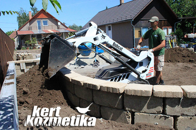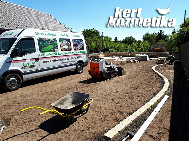 Az ágyásszegélyek elkészülte előtt 40 m³ termőföld került elterítésre, amely megadta a szegélyek kivitelezésének végleges szintjét. A termőföld terítésénél és a növényágyások feltöltésénél a Bobcat MT50-es kis gépünk már nagy segítségünkre volt.