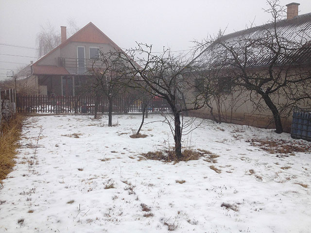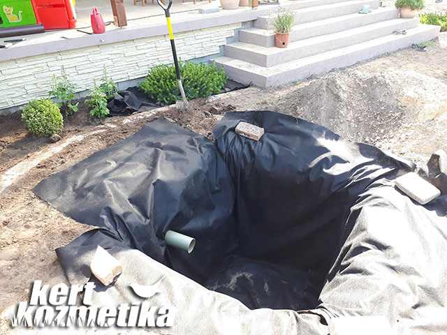A háztetőről lefolyó víz elvezetéséhez 2 db 1,5 m³-es szikkasztót ástunk ki. Geotextillel kibéleltük, osztályozott kaviccsal feltöltöttük. A harmadik ereszcsatornát a gépkocsibeálló melletti, már használaton kívüli emésztőbe kötöttük. Összesen 44 m PVC cső került felhasználásra.