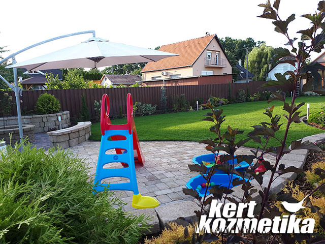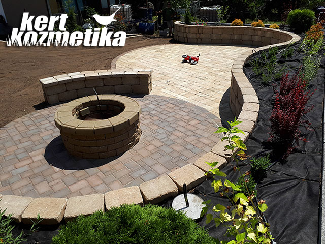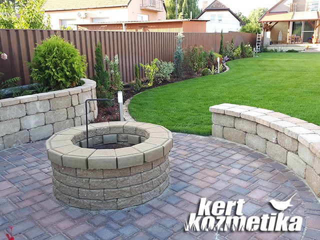 A burkolatok tükréből kikerülő földet az emelt ágyás feltöltésére használtuk fel még a szegélyek lerakása előtt. A burkolatokat teljesen vízszintbe kellett kialakítanunk. A sütögető részre Romanico barna mix térkőből egy 3 m átmérőjű (≈ 7 m²) kör alakú burkolat készült, középre lisszabon kerti sütögetővel. Mellé Caesar térkőből egy kb. 30 m²-es, szabálytalan formájú játszóterületet burkoltunk, ahol a gyerekek homokozhatnak, csúszdázhatnak, motorozhatnak. A két burkolat határába blokk kőből egy 2 m-es íves pad is készült.