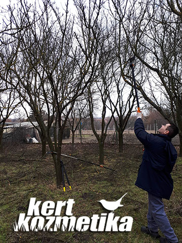 A kertépítés megkezdése előtt február végén a hátsó kertrészben közel 50 db gyümölcsfát metszettünk meg. A fák évek óta nem kaptak komolyabb ritkítást: sok elszáradt, elöregedett ág volt rajtuk, amelyek az utóbbi időben termést sem hoztak. Több fánál a gyöktörzs sérülése miatt sarjhajtások is megjelentek, amelyek elvonták a hasznos tápanyagot a fa többi részétől. Sok fa egymásra is nőtt, ezért a koronák között is növeltük a teret, hogy megfelelően fejlődhessenek. Az átépítésre kijelölt kertrészben több közepes méretű gyümölcsfa kivágására is sor került. A levágott ágakat nagyobb kupacba gyűjtöttük, amelyek későbbi aprítással a kialakított növényágyások egy részére kerültek.