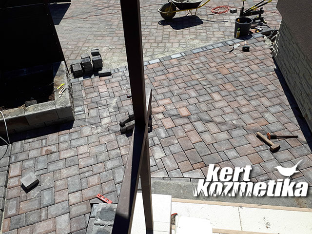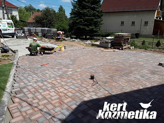 A gyepszőnyegezést követően megkezdtük a kocsibehajtó térburkolását. A burkolatra 6 cm vastag Romanico barna mix térkő került. A szegélyekhez a tulajdonos antracit színű Romanico térkövet rendelt, hogy szépen elüssön a barnamix burkolattól. A szegélyek nyomvonala több helyen régen kivágott fenyő tuskókba ütközött, ezért ezek eltávolítására is szükség volt. A burkolathoz kb. 80 m szegélyt helyeztünk le. A közel 200 m²-es kocsibeálló alá 10 cm vastagon összesen 24 m³ földnedves betont hozattunk, amelyet gondosan bevasaltunk és tömörítettünk. A földnedves betont a Bobcat MT50-es kisgépünkkel hordtuk szét, így az alapozás 1 nap alatt elkészült. A burkolást hátulról kezdtük a kapu irányába, és a 3 méretű térkövet szabálytalan elrendezésben helyeztük le, hogy természetesebb hatást keltsen. A burkolat szélét a teljes szegély mentén végig kellett vágni, ami jelentősen megnövelte a burkolás idejét. A levágott selejtes térköveket és a kert több pontján keletkezett betontörmeléket a régi emésztő feltöltésére használtuk fel.