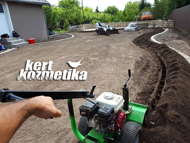 A tereprendezés előtt két héttel gyomírtóval lekezeltük a területet. Májusban indultak a kertépítési munkálatok. A terület sok helyen építkezési hulladéktól volt szennyezve. A tereprendezést egy kisebb Bobcat MT50-es kis gépünkkel kezdtük, ami az elején szervizelésre szorult, így egy nagyobb Bobcattel folytattuk a munkát. A hátsó kertben terepet rendeztünk, a garázs előtt pedig 15–20 cm vastag betont törtünk, kézi rásegítéssel a nehezebben hozzáférhető helyeken. A teherautó és a konténeres autó több fordulóban összesen kb. 80 m³ fellazult tarackos földet, betont és építési hulladékot szállított el.